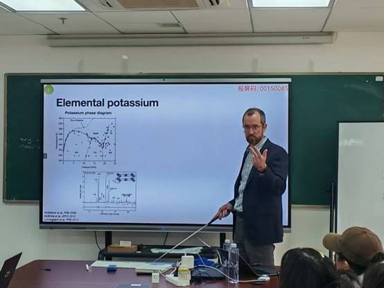 2025年12月2日下午, Andreas Hermann教授在东教楼1104学术报告厅为数理学院部分物理学专业和材料与化工专业的博士生、硕士生和青年教师作了题为“From DFT to thermodynamic modelling”的学术报告。报告以近期关于“同时具备固体与液体特征的新物态”的报道为切入点,系统阐述他们研究团队在高压物理与计算材料学领域的系列工作。Andreas Hermann教授从钾的高压相图与非共格宿主—客体结构详细阐述了“链熔融”作为一种热力学中间态的证据与机制,提出了碱金属高压相可作为部分电子化合物的观点,展示了如何利用机器学习分子动力学模拟预测相变、熔化线极值及热力学性质,介绍了基于Bragg-Williams模型的两态热力学理论,解释了金属熔化线中的临界行为。此外,Andreas Hermann教授还介绍了第一性原理计算在高压冰(VII–VIII–X)相变研究中的应用,探讨了隐藏临界点与相图拓扑等前沿问题,展望了机器学习在预测复杂材料行为方面的潜力。报告期间,Andreas Hermann教授与在场师生就高压相变机理、机器学习势函数开发等相关问题展开了深入讨论并细致回答了师生提问。