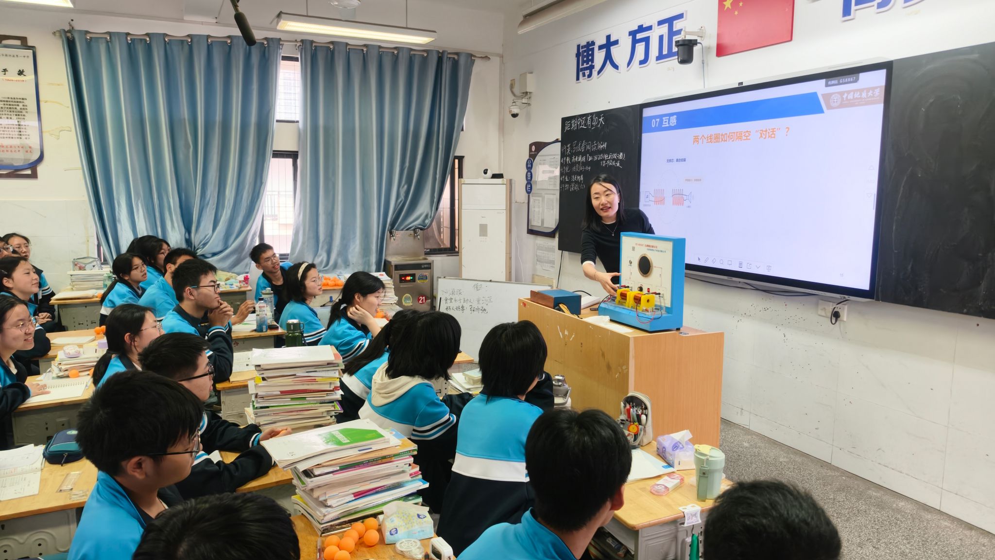 紧随其后的物理科普课堂上,吴妍老师以《从神奇现象到现代技术——走进大学物理》为题,用一系列趣味演示实验为同学们打开了大学物理之门。她以“我们生活在一个被‘看不见的力量’支配的世界”为核心线索,通过马德堡半球、乒乓球炮弹、科氏力、角动量守恒、磁阻尼摆、互感现象等一系列经典演示实验,生动展现了力学、电磁学等物理知识在日常生活与现代技术中的广泛应用,引导同学们从直观的实验现象中探寻背后的物理规律。亲手操作、沉浸式观察的互动形式,让抽象的物理公式变得鲜活可感,现场同学们频频发出惊叹,课堂氛围十分热烈,极大激发了同学们对基础物理学科的探索热情,在大家心中种下了崇尚科学、探索未知的种子。