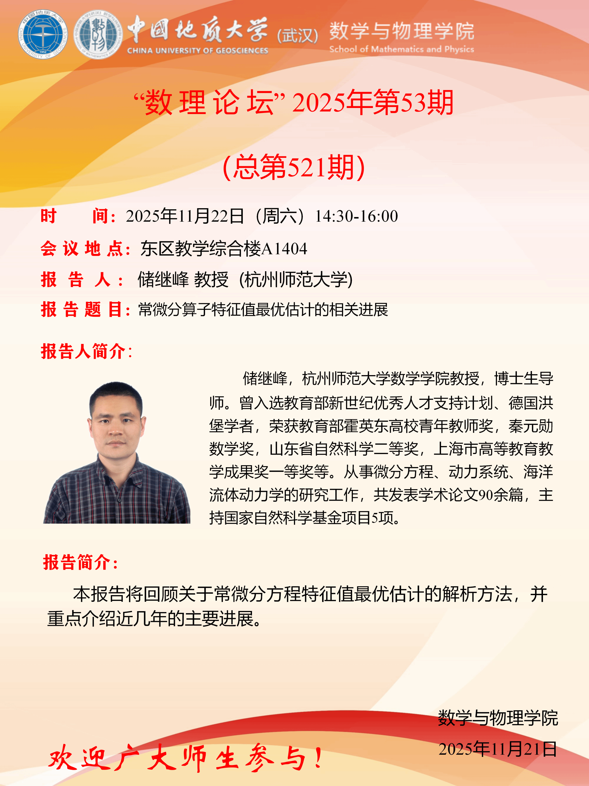 2025年11月22储继峰教授学术讲座:常微分算子特征值最优估计的相关进展