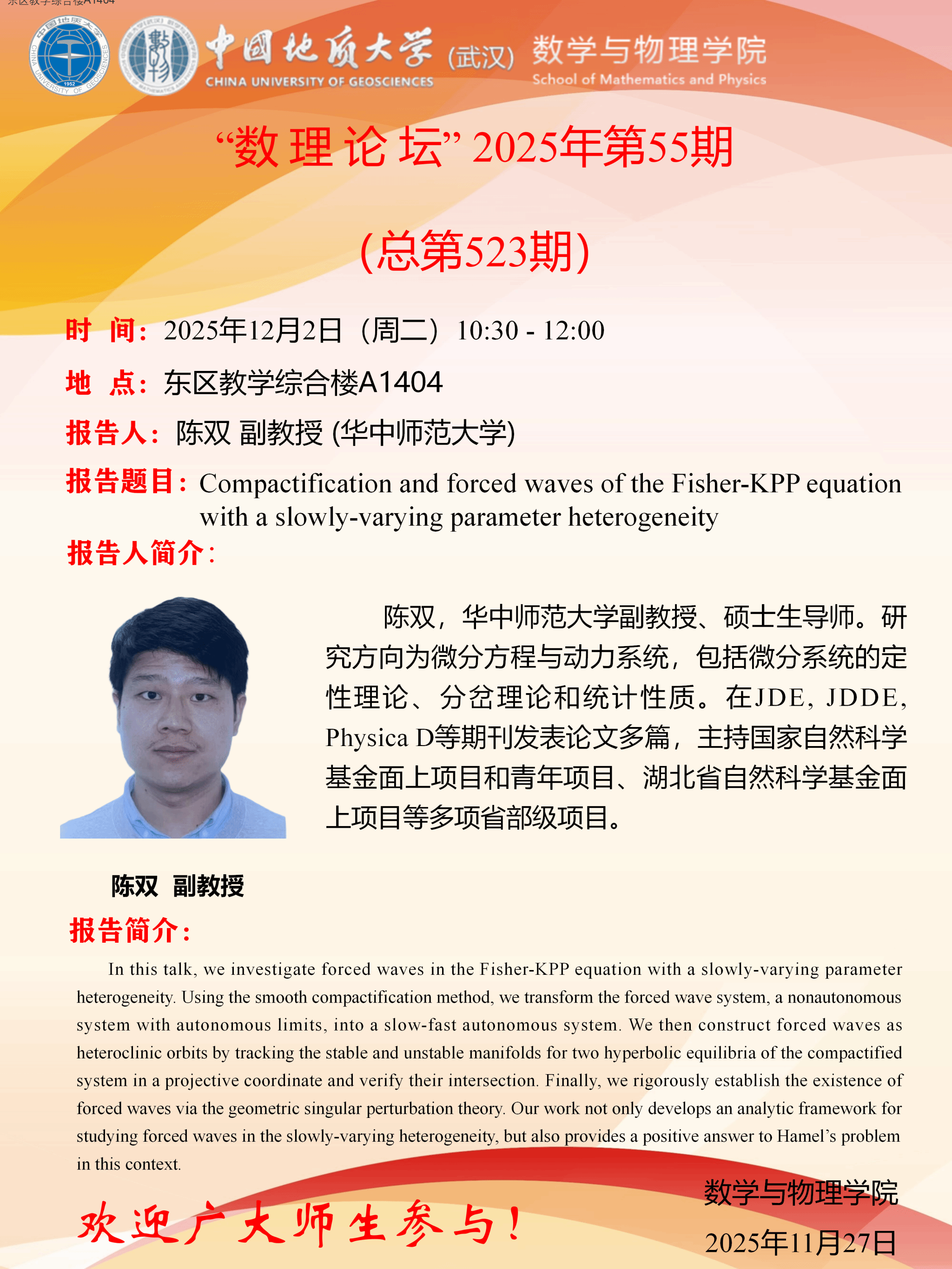 2025年12月2日陈双副教授学术讲座:Compactification and forced waves of the Fisher-KPP equation with a slowly-varying parameter heterogeneity