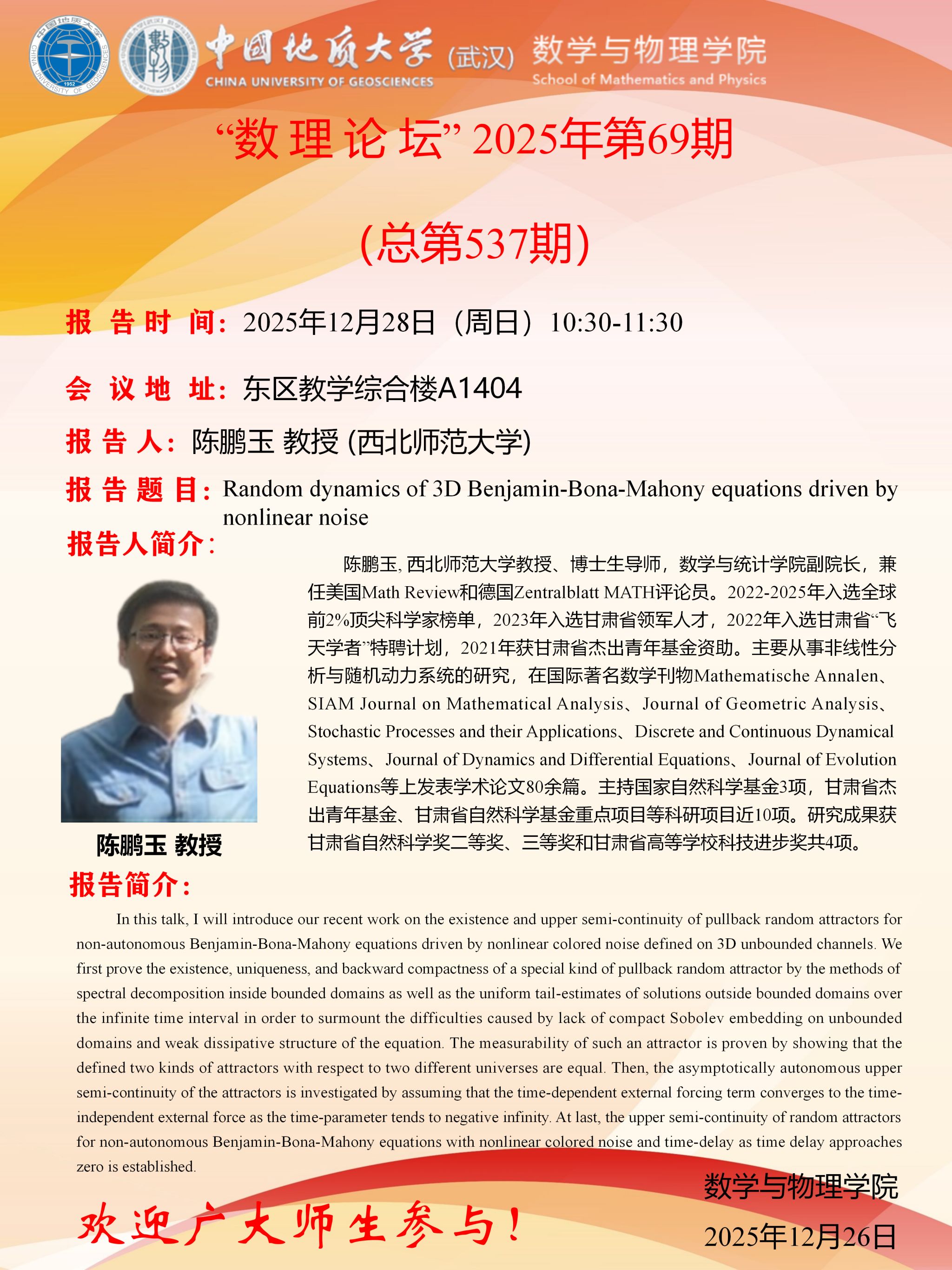 2025年12月28日陈鹏玉教授学术讲座:Random dynamics of 3D Benjamin-Bona-Mahony equations driven by nonlinear noise