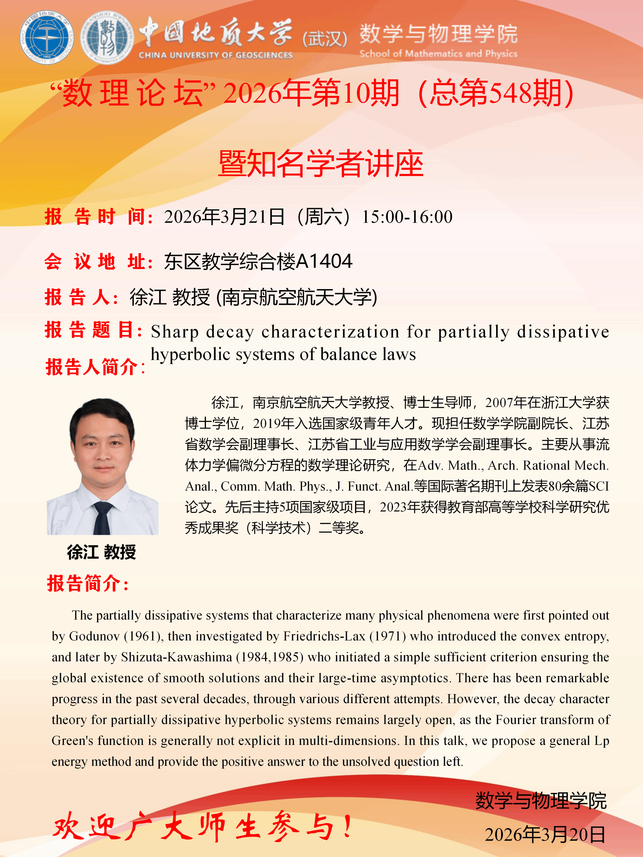 2026年3月21日徐江教授学术讲座:Sharp decay characterization for partially dissipative hyperbolic systems of balance laws